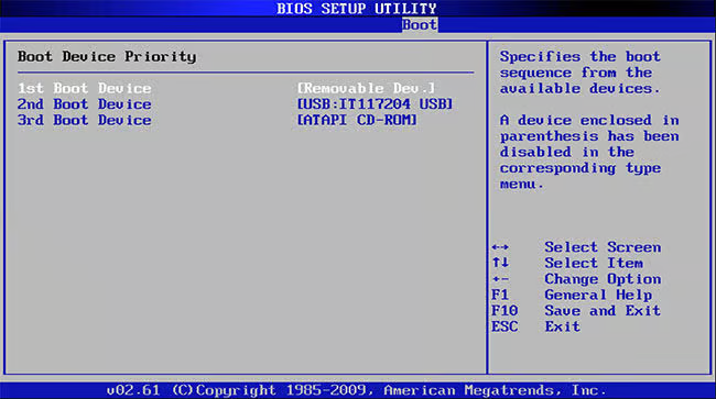 「1st Boot Device」と書かれているところにUSBが来るように上下左右の矢印キーを使いながら変更をします。