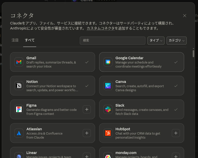 3,Claudeと接続可能なWebサービスの一覧が現れます。