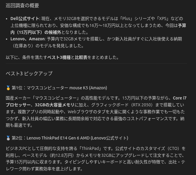 新入社員向けにWindowsノートPCを3台調達したい。予算1台15万円以下、メモリ32GB以上。ブラウザでDellとLenovoの公式サイト、Amazonを実際に巡回し、現在在庫があって条件を満たす機種ベスト3をピックアップして。価格、スペック、納期の比較表を作って