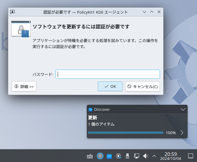 システムに変更を加えるときには一時的に管理者になる必要があるのでパスワードを入力。ログイン時のものと同じパスワードです。