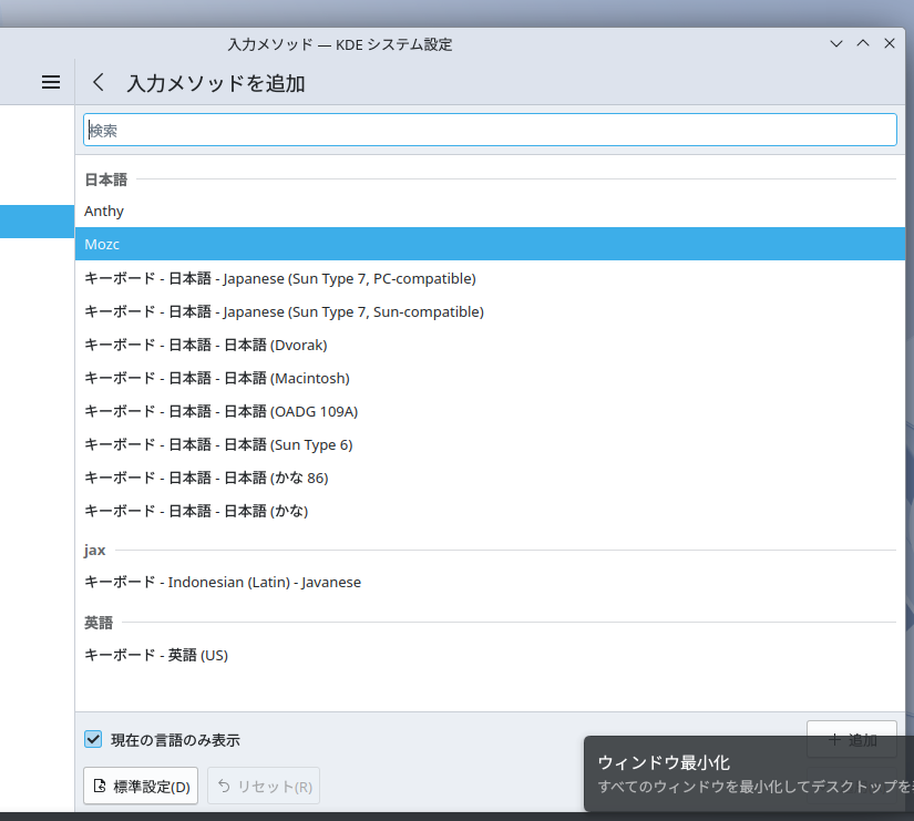 現れた画面で「+入力メソッドを追加」をクリック。「Mozc」を選択して「+追加」