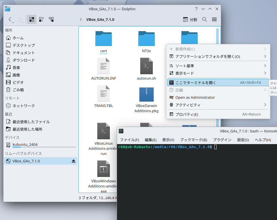 フォルダー内の何も無いところで右クリック>「ここでターミナルを開く」を選択。すると端末(Konsole)内で仮想CD-ROMの中身のディレクトリーが表示されます。