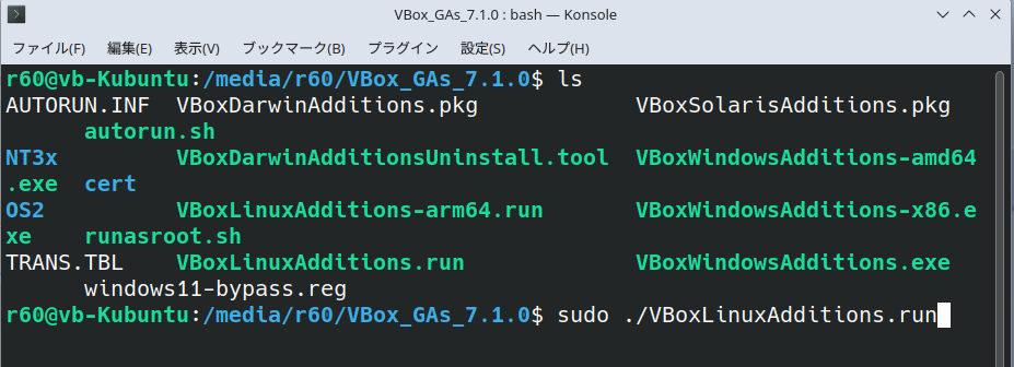 「sudo ./VBoxLinuxAdditions.run」+Enter:管理者権限でスクリプトを実行します。