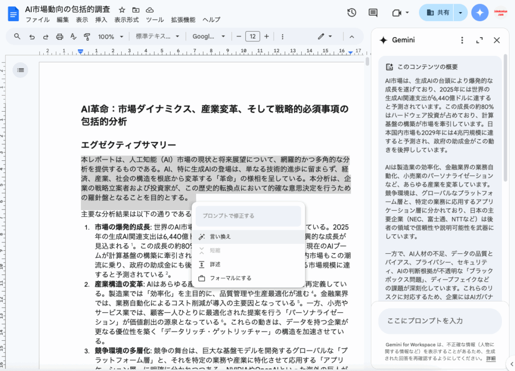Googleドキュメントなら、サイドペインのGeminiを呼び出して(右上部の星アイコンをクリック)プロンプトで依頼することで要約を作成したり、文章量を半分などにしたり、修正したい部分を選択して追加で編集することもできます。