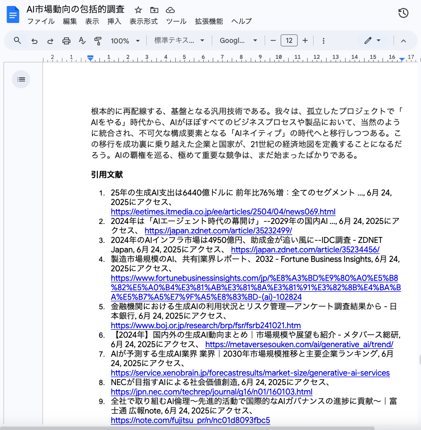 今回試しに生成されたレポートは、27ページ、3万文字に及ぶ分量となりました。