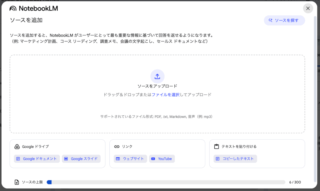 - ソースの上限: 1つのノートブックに無料版では最大50個のソース、有料版(NotebookLM Plus)では最大300個まで対応。また、一つのソースごとに単語数: 最大50万語、ファイルサイズ: 最大200MBが上限になっています。(本稿執筆時)