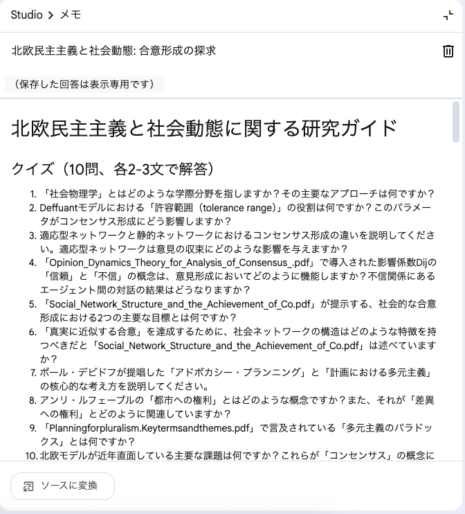 自分でアップロードした資料(ソース)だけを情報源として、的確な要約、解説、アイデア出しまでこなす、まさに「自分専用のパーソナルAIアシスタント」です。