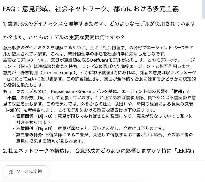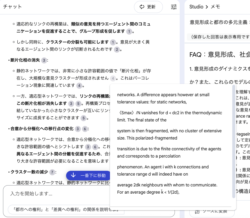 - 出典の明記: AIのすべての回答には、ソースのどの部分を参照したかを示す引用番号が付きます。